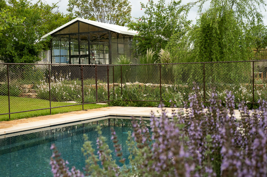 הגינה כוללת משרד חוץ עצמאי הממוקם על טרסת אבן בבנייה יבשה שיוצרת תחושת טבעית, פינת מדורה אינטימית, ובריכת שחייה,