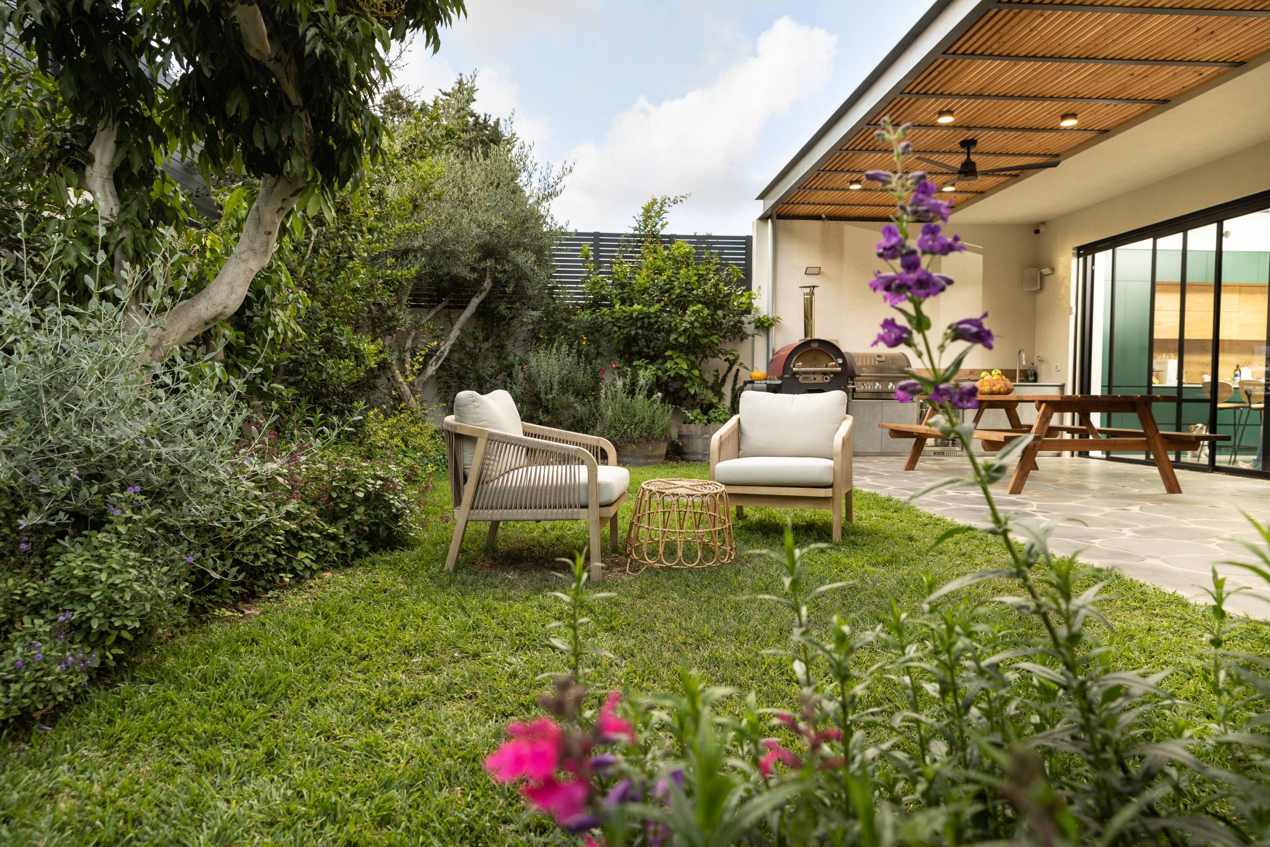 גינה בהרצליה. בחרנו באבן בזלת טבעית לריצוף המרפסות וגם לשבילים בגינה.